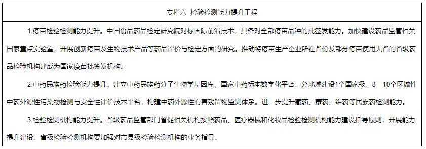 5.加強檢驗檢測體系建設(shè)。加強藥品、醫(yī)療器械檢驗檢測關(guān)鍵技術(shù)和平臺建設(shè)。以中國食品藥品檢定研究院為龍頭、國家藥監(jiān)局重點實驗室為骨干、省級檢驗檢測機構(gòu)為依托,完善科學(xué)權(quán)威的藥品、醫(yī)療器械和化妝品檢驗檢測體系。國家級檢驗機構(gòu)著重瞄準(zhǔn)國際技術(shù)前沿,強化重點專業(yè)領(lǐng)域檢驗?zāi)芰ㄔO(shè)。地方各級檢驗機構(gòu)針對日常和應(yīng)急檢驗需求,補齊能力短板,力爭具備應(yīng)對突發(fā)公共衛(wèi)生事件“應(yīng)檢盡檢”能力。圍繞藥品關(guān)聯(lián)審評審批及監(jiān)管需要,推動建立布局合理、重點突出的藥用輔料和藥包材檢驗檢測體系。